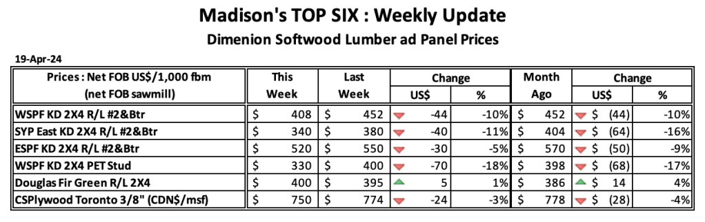 2024년 4월 19일로 마감한 주의 Southern Yellow Pine East Side 2×4 #2&Btr KD (RL)의 가격은 US$340 mfbm으로 전주 가격인 $380과 비교하여 $40, 11% 하락하였고, 전월 가격인 US$404 mfbm에 비하여 $64, 16% 낮았습니다. 1년전 같은 시기의 가격인 US$545 mfbm와 비교하면 $205, 38% 하락하였지만, 2년전 같은 시기의 가격인 $815에 비하면 $475, 58% 하락하였습니다.