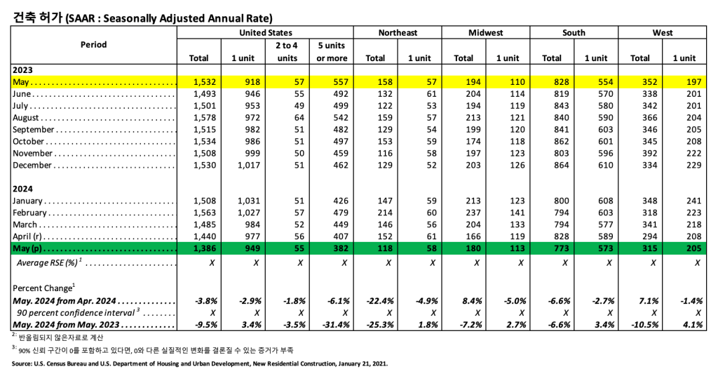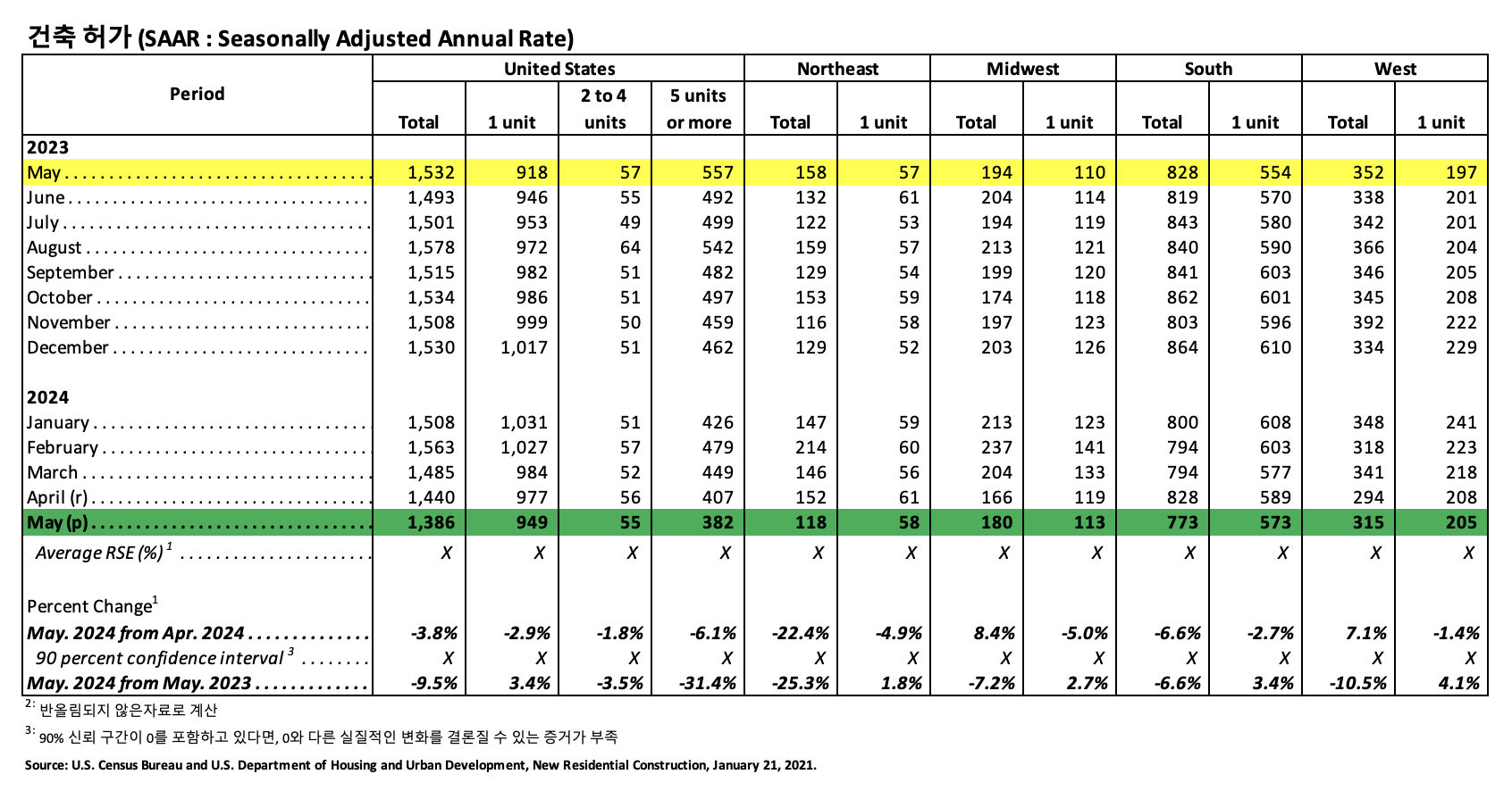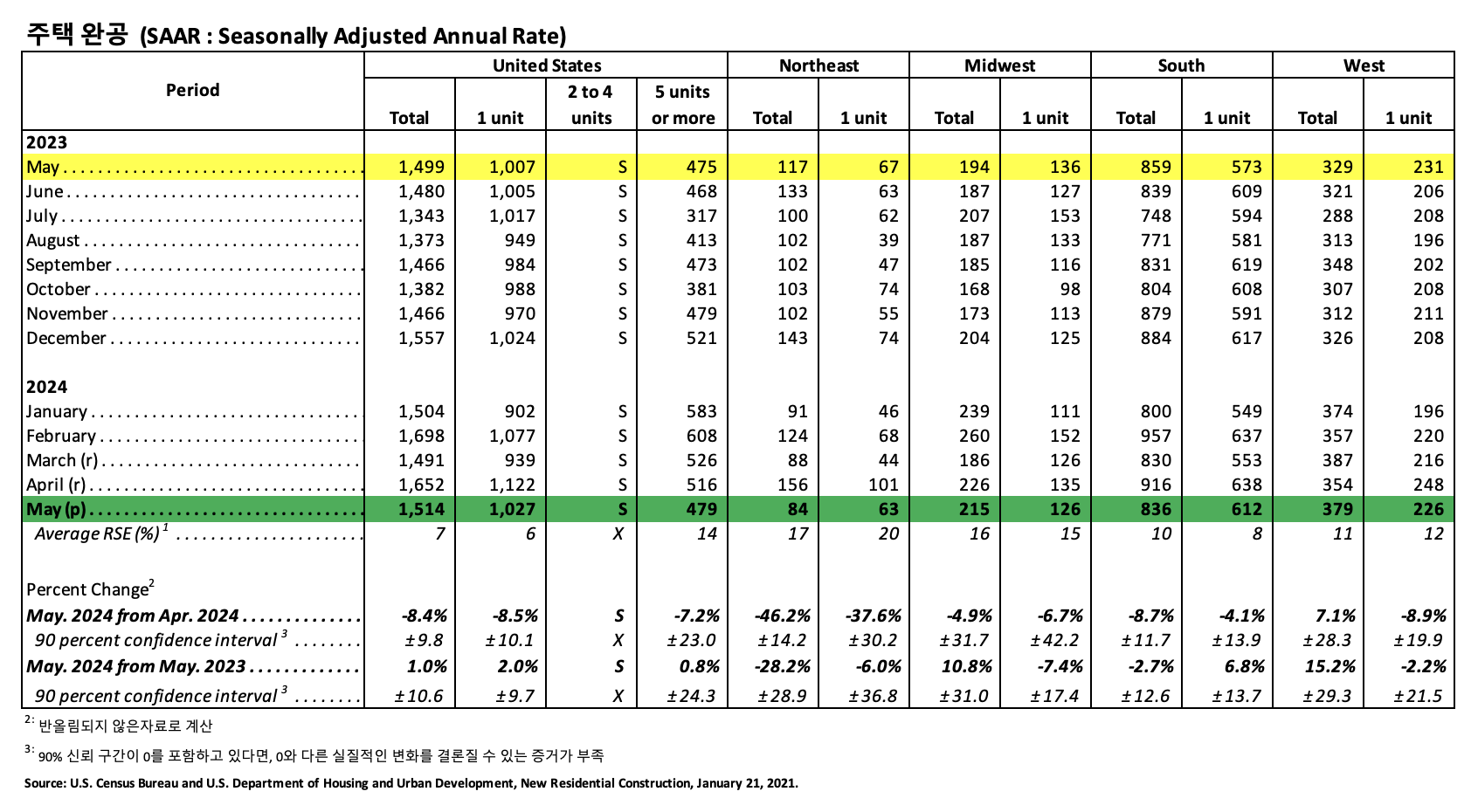 미국 인구 통계국 (U.S. Census Bureau)과 미국 주택과 도시 개발부 (U.S. Department of Housing and Urban Development)는 2024년 5월 미국 거주용 주택 건설 통계 자료를 합동으로 발표하였습니다.