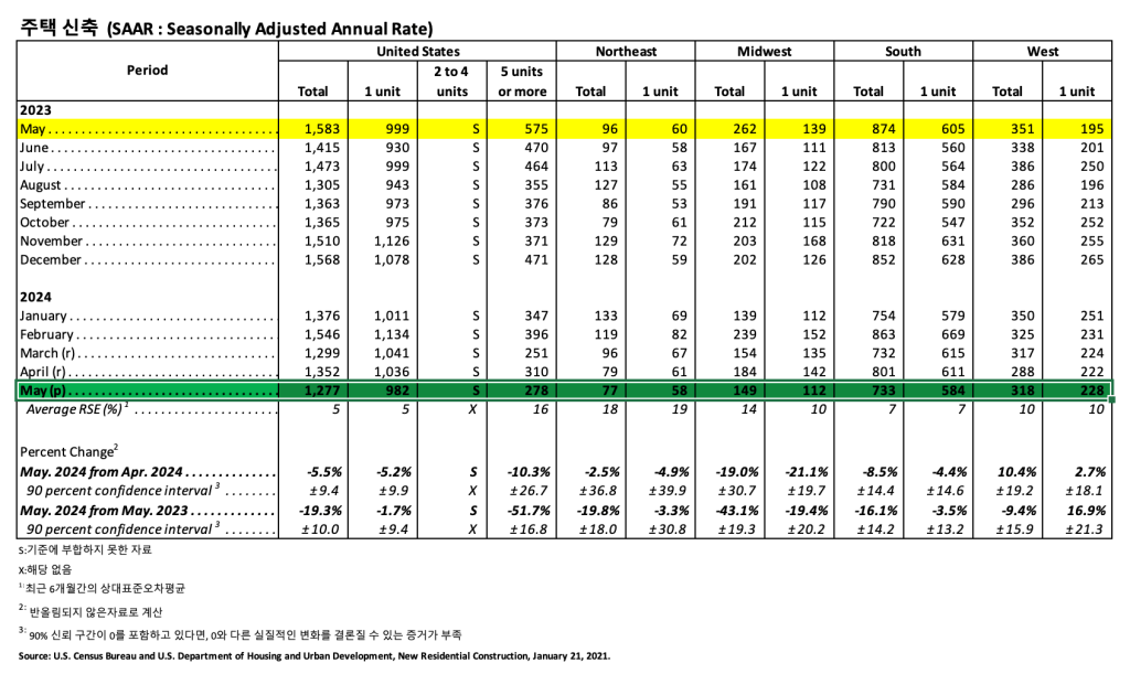 2024년 5월 사유 주택 신축은 1,277,000 (SAAR)으로, 2024년 4월 (1,352,000) 보다 5.5% (±9.4%) 하락하였고, 2023년 5월 (1,583,000) 보다는 19.3% (±10.0%) 낮았습니다. 5월의 단독 주택 신축은 982,000 (SAAR)으로 2024년 4월 (1,036,000)과 비교하여 5.2% (±9.9%) 하락하였습니다. 5가구 이상의 다중 주택 5월 신축은 278,000 (SAAR) 이었습니다.