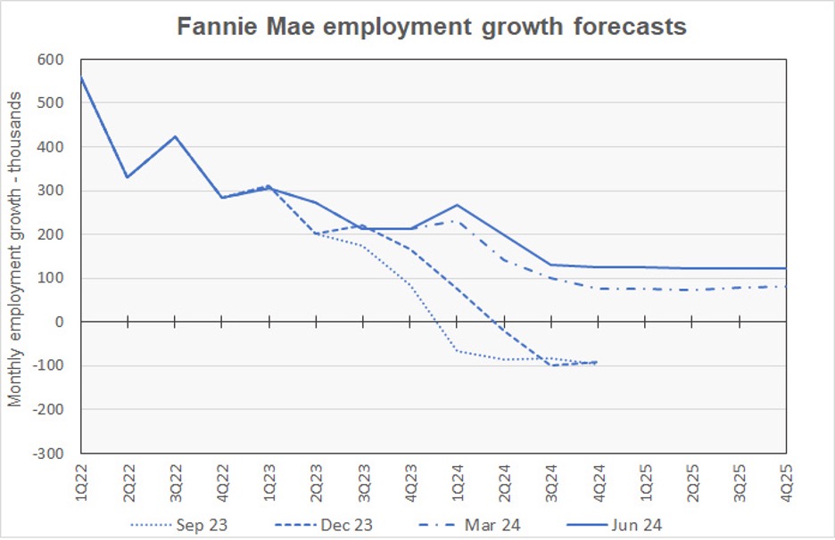 고용 성장 분기 예상 개정은 2024년 2사분기를 제외하고는 모두 하락 조정되었습니다. 지금 월간 고용 성장은 지난달 예상보다 19,000 상승하여 198,000 이었습니다. 월간 고용 성장은 2사분기 수준에서 하락하기 시작하여 2024년 4사분기에 126,000 드리고 2025년 4사분기에 121,000이 될 것으로 예상하고 있습니다. 참고적으로 노동 통계청 (Bureau of Labor Statistics)의 고용 상황 보고서에 따르면 2024년 2사분기의 처음 2개월 동안 추가된 고용 평균은 월간 219,000이었습니다. 지난달 예상과 비교해보면 2024년과 2025년의 연간 고용 성장은 변화가 없었습니다. 2024년 고용 성장의 예상은 2,200,000이고, 2025년의 예상은 1,500,000 입니다.