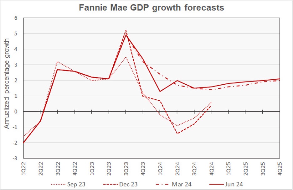 Fannie Mae는 2024년 1사분기 GDP 성장 예상을 1.6%에서 1.3% 낮추어서 예상하였고, 이는 경제 분석국 (Bureau of Economic Analysis)의 2차 추정과 동일 하였습니다. Fannie Mae는 2024년 2사분기와 3사분기 GDP 성장 예상을 각각 0.4%.0.3% 낮추었습니다. 그래서 GDP 성장 예상은 2사분기는 2.0%, 3사분기는 1.5% 입니다. 2024년 4사분기와 2025년 1사분기에 대한 GDP 성장 예상은 0.1% 상승하여 개정되었지만, 2025년 3사분기에는 0.1% 낮추어서 수정하였습니다. 연간 GDP 성장 예상을 살펴보면 2024년에는 1.6%로 낮추어서 수정하였고, 2025년에는 1.9%로 변화 없이 유지하였습니다.