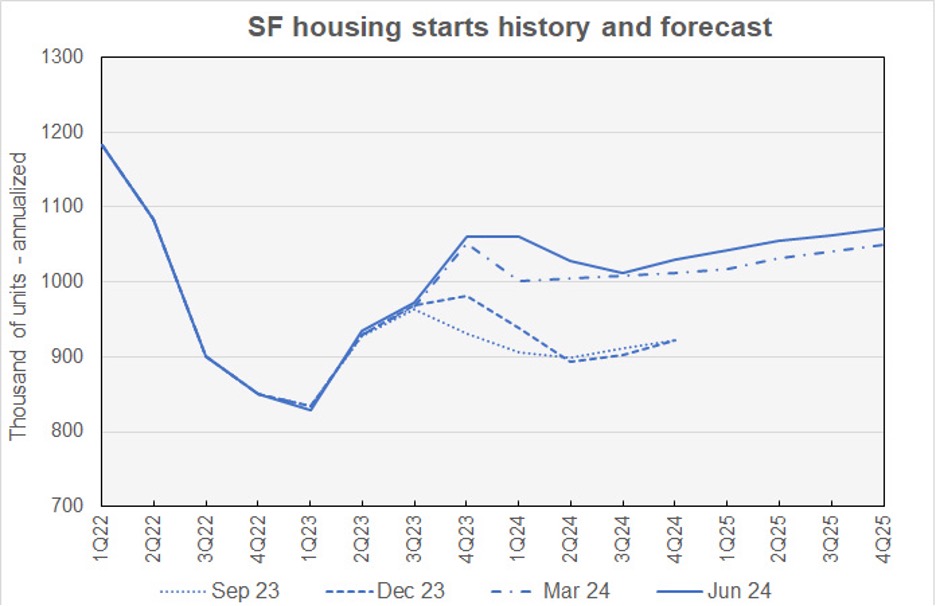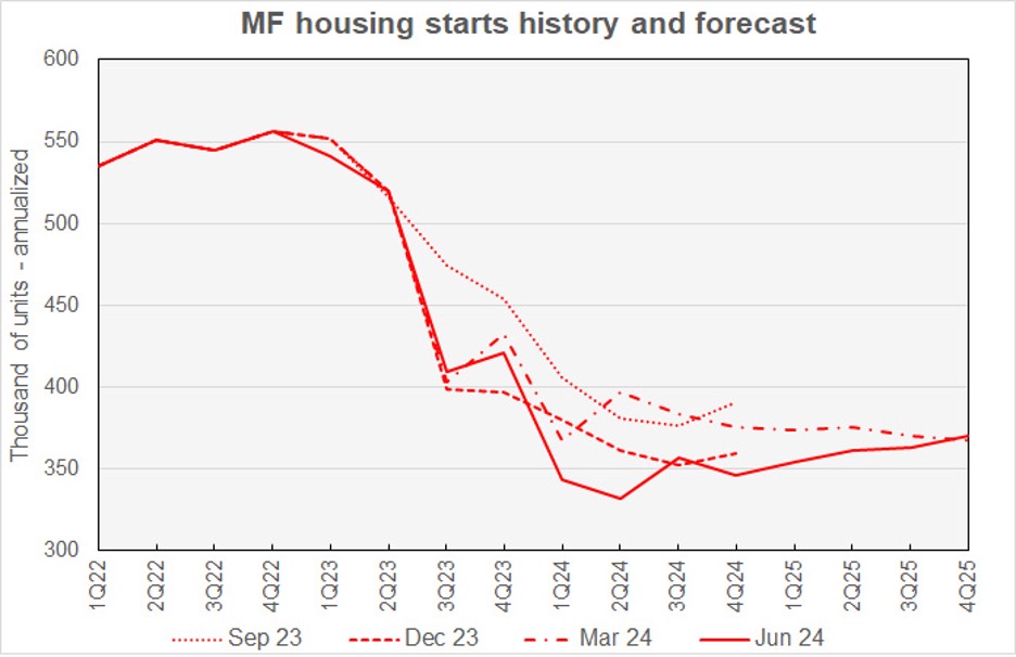 지난 2달의 월간 예상보다 낮게 수정한 이후에 다세대 주택 신축 예상은 이번달에 약간 더 우호적인 이자율 예상때문에 높게 수정되었습니다. 2024년 1사분기와 2사분기 신축 수 예상은 낮아졌지만, 2024년 3사분기에서 2025년 4사분기까지 다세대 주택 신축 수 예상은 연간 단위로 14,000-28,000으로 상승하였습니다. 현재 예상은 다세대 주택 신축이 2사분기에 연간 단위로 332,000의 낮은 수준에 도달하지만, 그 이후부터 2025년 말까지 천천히 연간 단위로 370,000 비율로 상승할 것이라고 현재 예상하고 있습니다. 참고로 Census Bureau의 가장 최근의 거주용 건설 보고서에 따르면 2024년 2사분기의 첫 달과 두번째 달에 다세대 주택 신축은 연간 비율로 306,000이었습니다. 연간 예상을 살펴보면 다세대 주택 신축의 2024년 예상수는 8,000을 높게 수정하여 344,000이었습니다. 그리고 2025년 다세대 주택 신축 수는 16,000 높게 수정하여 362,000이었습니다.