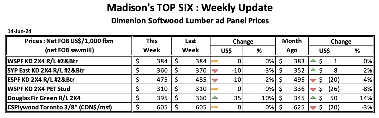 2024년 6월 14일로 마감한 주의 침엽수 제재목 기준 가격인 Western S-P-F 2×4 #2&Btr KD (RL)의 가격은 US$384 mfbm으로 전주 가격인 $384와 변화가 없었고, 전월 가격인 US$383 mfbm보다는 $1, 0% 높았습니다. 1년전 같은 시기의 가격인 US$390 mfbm와 비교하면 $6, 2% 하락하였고, 2년전 같은 시기의 가격인 $660보다 $276, 42% 낮았습니다.