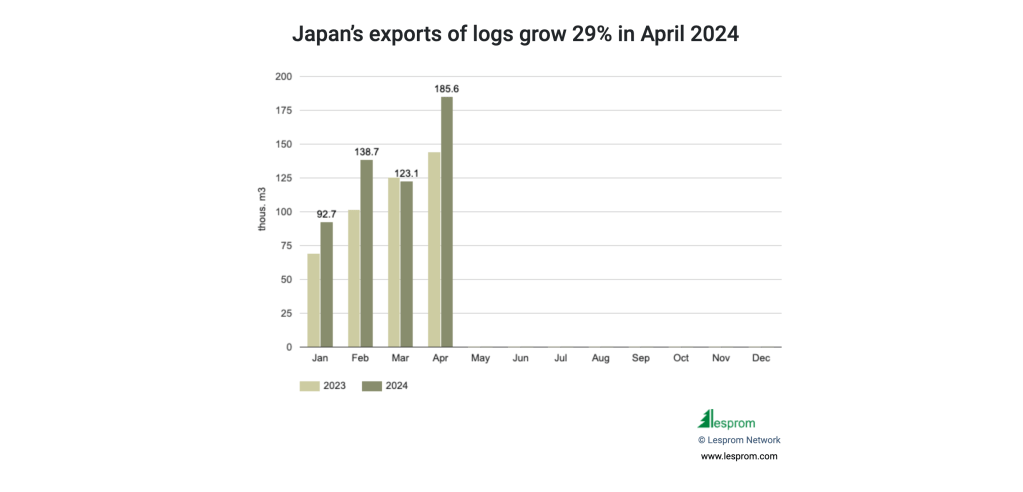 2024년 4월 일본의 원목 수출량은 전년대비 28.5% 증가하여 185.6 thousand m3 이었고, 수입액도 19.8% 증가하여 $19.0 million이었습니다. 4월 일본 원목 수출 평균 가격은 6.7% 하락하여 $102.4/m3 이었습니다.