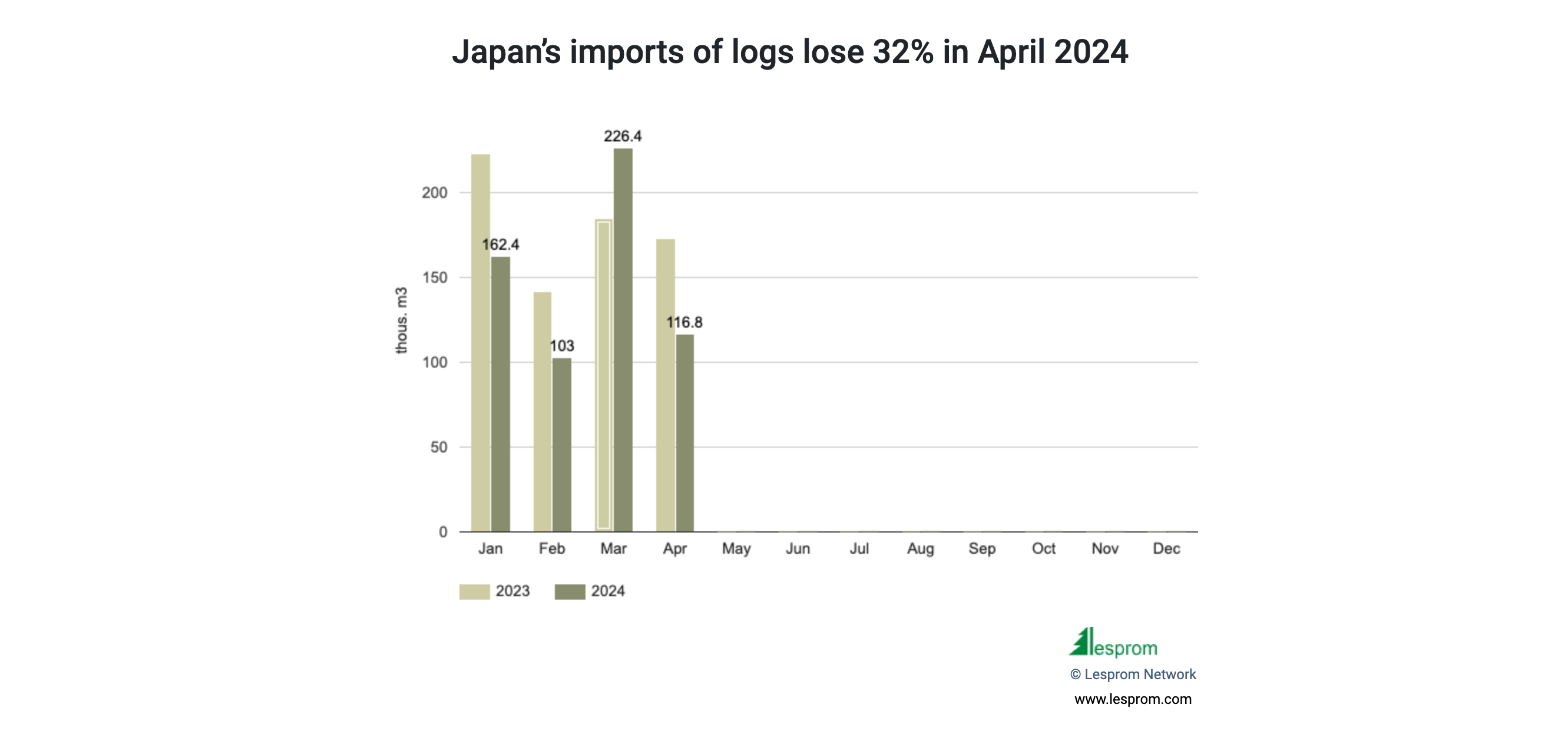 2024년 4월 일본의 원목 수입량은 전년대비 32.3% 감소하여 116.8 thousand m3 이었고, 수입액도 25.6% 하락하여 $37.3 million이었습니다. 4월 원목 일본 수입 평균 가격은 10.0% 하락하여 $319.0/m3이었습니다.