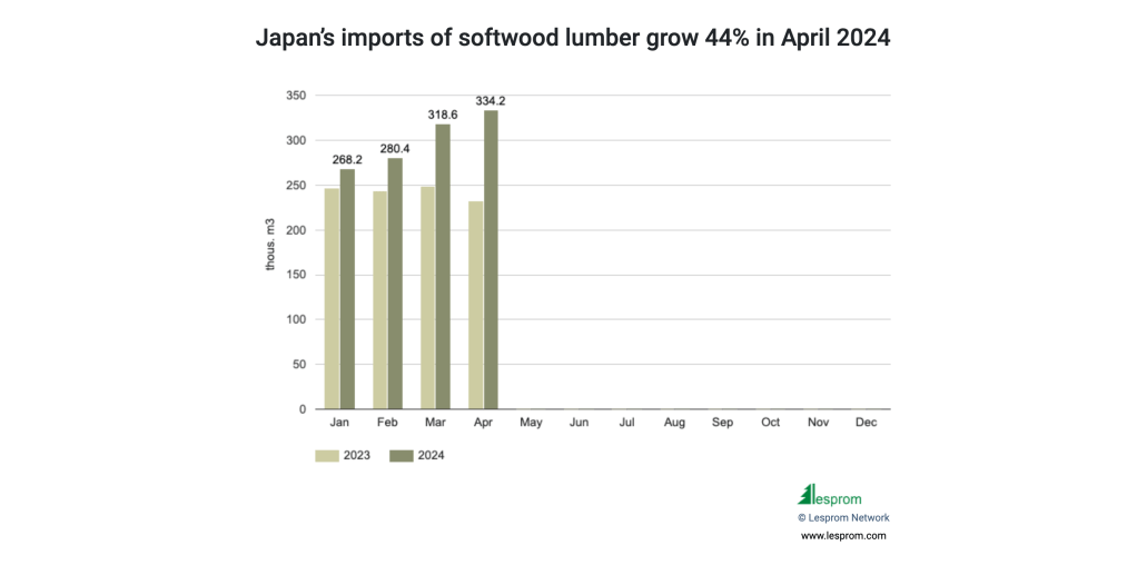 2024년 4월 일본의 침엽수 제재목 수입량은 전년대비 43.6% 증가하여 334.2 thousand m3이었고, 수입액도 26.0% 상승하여 $117.0 million이었습니다. 4월 일본의 침엽수 제재목 수입 평균 가격은 12.3% 하락하여 $350.1/m3이었습니다.