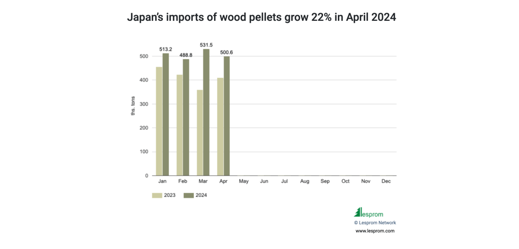 2024년 4월 일본의 wood pellets 수입량은 전년대비 22.1% 상승하여 500.6 thousand tons 이었고, 수입액도 12.2% 증가하여 $100.3 million이었습니다. 4월 일본의 wood pellets 수입 평균 가격은 8.1% 하락하여 $200.4/ton이었습니다.