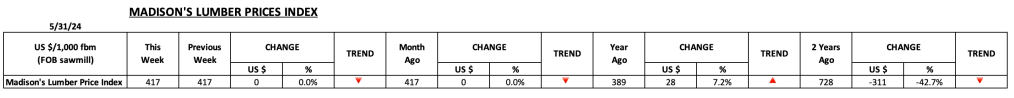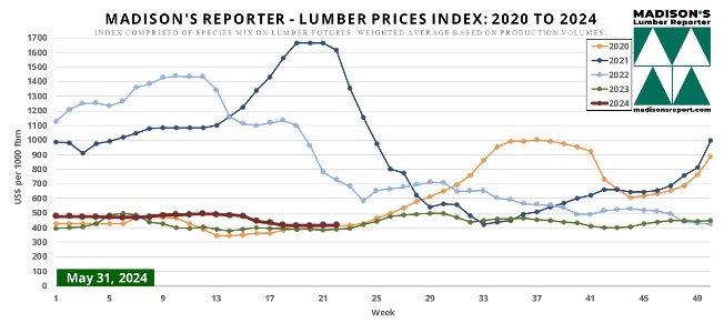 PF Olsen의 보고서는 뉴질랜드 산림 소유주와 원목 수출업체들에게 특히 벌목 조건이 개선되는 뉴질랜드 여름 동안에 하락하는 수요에 조정하라는 권고를 하였습니다. 4월에 뉴질랜드 원목의 중국 수출은 전년대비 15% 하락하여 1.48 million m3이었지만, 2024년 1월에서 4월까지 뉴질랜드 원목의 중국 수출량은 전년대비 23% 증가하여 6.8 million m3이었습니다. 2024년 5월 항구에서 (At Wharf Gate : AWG) 원목 가격은 시장 움직임이 최소화되면서 변화가 없이 유지되었습니다. 6월 원목 가격은 완만한 상승이 예상되지만, 상승한 운송 비용과 강한 NZD가 이런 상승을 막을 수 있어서 뉴질랜드 AWG 가격에 영향을 줄 수 있습니다. 제재목에 대한 뉴질랜드 자국 수요도 낮아서, 즉각적으로 다수의 제재소들이 주문에 조정하여 생산량을 감소시키고 있습니다. PF Olsen 원목 가격 지수는 NZ$113으로 2년전 평균보다 NZ$6 낮았고, 3년전과 5년전 평균보다 NZ$7 하락하였습니다.