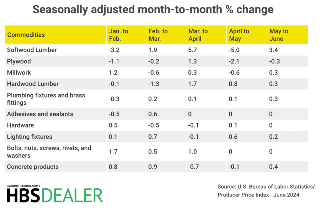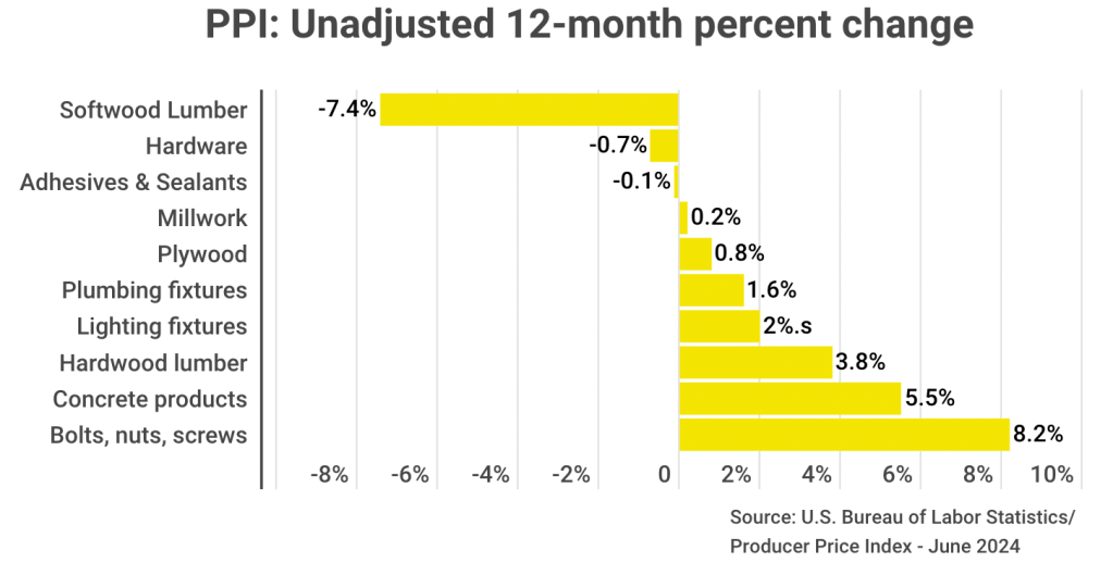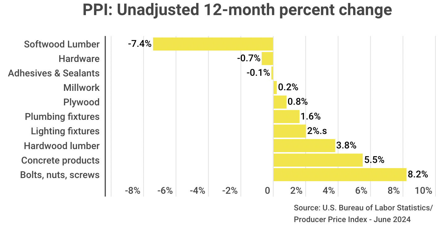 2024년 5월부터 6월까지 침엽수 제재목 생산자 가격 지수(Producer Price Index)는 3.4% 상승하여 5.0% 하락을 기록한 5월부터 큰 변화를 보여주었습니다. 이는 아래의 차트에서 보여 주듯이 10 원자재 중에서 단연코 가장 극적인 전월대비 변화를 보여주었습니다. 그리고 침엽수 가격 지수는 1년전보다 7.4% 하락하였습니다. 7월 12일 아침에 미국 노동 통계청(U.S Bureau of Labor Statistics)이 발표한 최종 수요에 대한 생산자 가격 지수 (Producer Price Index)는 6월에 전체적으로 0.2% 상승하였습니다.