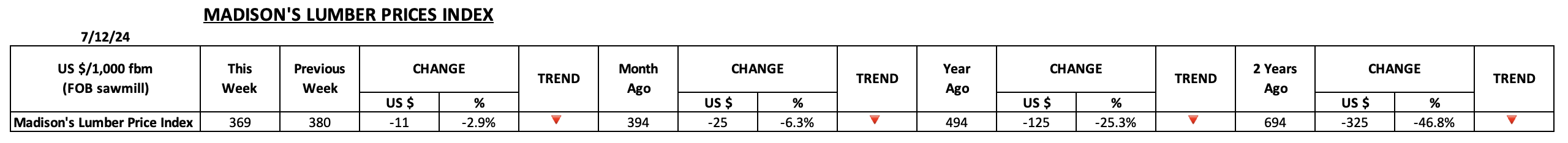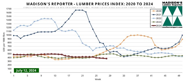 Madison 제재목 가격 지수는 3% 하락 16 Tuesday Jul 2024 Posted by KIM, HANSEOK in Uncategorized ≈ Leave a comment 2024년 7월 12일로 마감한 주의 Madison 제재목 가격 지수는 US$369 mfbm으로 전주 US$380과 비교하여 $11, 3% 하락하였습니다. Madison 제재목 가격 지수는 선물(WSPF, ESPF, Douglas fir, Hem-Fir)로의 동일 수종을 이용하여 구성되어 있습니다. 그리고 지난 몇 년 동안의 북미 생산량 비율에 기초한 가중 평균을 사용하고 있습니다. Share this: Click to email a link to a friend (Opens in new window) Email Click to print (Opens in new window) Print Click to share on X (Opens in new window) X Click to share on Facebook (Opens in new window) Facebook Click to share on LinkedIn (Opens in new window) LinkedIn More Click to share on Pinterest (Opens in new window) Pinterest Click to share on Tumblr (Opens in new window) Tumblr Click to share on Reddit (Opens in new window) Reddit Click to share on Pocket (Opens in new window) Pocket Like Loading... Related