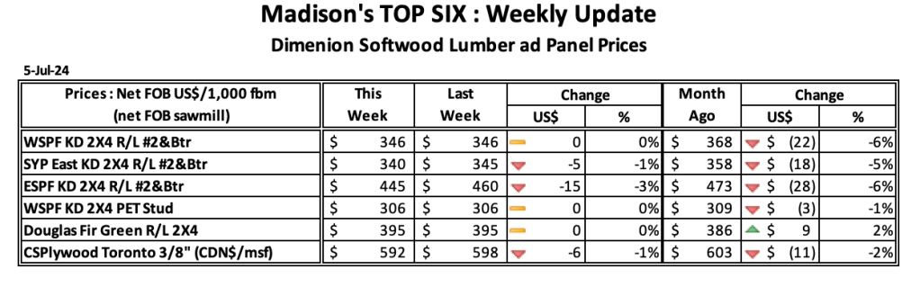2024년 7월 5일로 마감한 주의 침엽수 제재목 기준 가격인 Southern Yellow Pine East Side 2×4 #2&Btr KD (RL)의 가격은 US$340 mfbm으로 전주 가격인 US$345 mfbm과 비교하여 $5, 1% 하락하였고, 전월 가격인 US$358 mfbm보다는 $18, 5% 하락하였습니다. 1년전 같은 시기의 가격인 $418과 비교하면 $78, 19% 하락하였고, 2년전 같은 시기의 가격인 $700보다는 $360, 51% 낮았습니다.