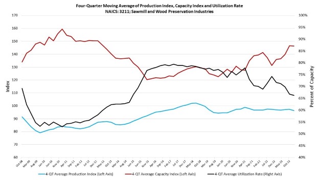 제재소와 목재 보존 산업 완전 가동률은 2분기 연속으로 약간 하락하여, 60.8%에서 60.4%로 하락하였습니다. 이런 하락은 산업의 생산 하락을 부분적으로 설명합니다. 부가적으로 이런 공장들은 주당 평균 공장 운영 시간이 하락하고, 이런 하락은 이런 회사들이 생산 능력을 중가시킨 것에 기인하지 않고 공장의 운영 시간 감소로 생산량의 하락 때문 입니다.