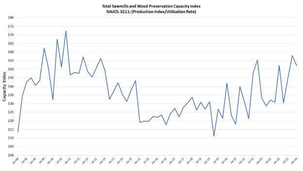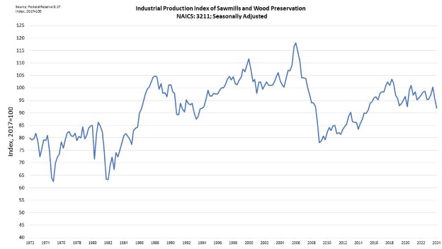 미국 제재소와 목재 보존 산업의 생산 지수는 1사분기에 2024년 초반보다 하락하여 91.9 이었습니다. 생산 지수는 2017년동안 실질 산출을 100의 수준으로 측정합니다. 이는 미국 연방 준비 위원회(Federal Reserve)가 최근에 발표한 G.17 데이터에 따르면 분기 수준에서 2번 연속 하락 입니다. 즉 2023년 4사분기 동안에 4.3% 하락한 이후에 2024년 1사분기에도 4.3% 하락하였습니다. 1년전과 비교하면 생산은 2024년 초반에 3.8% 낮아졌다고 National Association of Home Builders (NAHB)는 발표하였습니다.