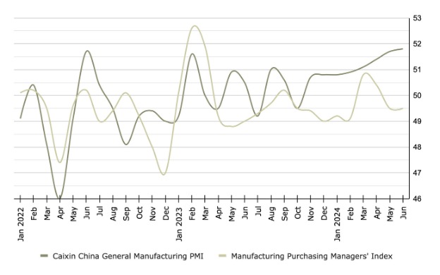 Dynamics of purchasing managers’ indexes in manufacturing sector of China / S&P Global, National Bureau of Statistics of China