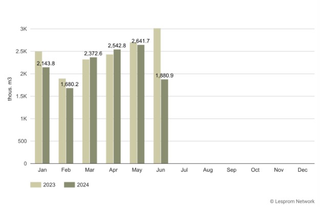 2024년 6월 중국의 원목 수입량은 전년대비 30% 하락하여 2.7 million m3이었고, 6월의 수입 평균 가격은 5월과 비교하여 8.4% 하락하여 $187/m3이었습니다.