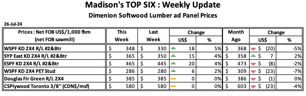 2024년 7월 26일로 마감한 주의 Southern Yellow Pine East Side 2×4 #2&Btr KD (RL)의 가격은 US$365 mfbm으로 전주 가격인 US$340 mfbm와 비교하여 $15, 4% 상승하였고, 전월가격인 US$358 mfbm에 비하면 $8, 2% 상승하였습니다. 1년전 같은 시기의 가격인 $425에 비하면 $60, 14% 하락하였고, 2년전 같은 시기의 가격인 $765에 비하면 $400, 52% 낮았습니다.