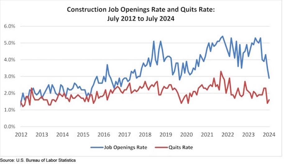 미국 노동 통계국(U.S. Bureau of Labor Statistics)의 구인과 노동 이동 설문(Job Openings and Labor Turnover Survey : JOLTS) 데이터의 Associated Builders and Contractors (ABC) 분석에 따르면 건설 산업은 7월말에 구인수가 248,000이라고 보고하여 6월보다 51,000 감소하였고, 2023년 7월과 비교하면 103,000 하락 하였습니다.