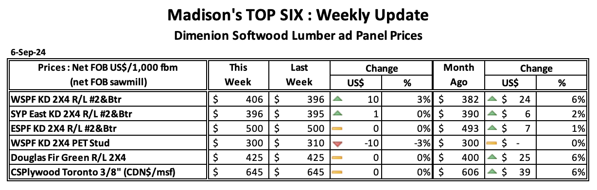 2024년 9월 6일로 마감한 주의 침엽수 제재목 기준 가격인 Western S-P-F 2×4 #2&Btr KD (RL)의 가격은 US$406 mfbm으로 전주 가격인 $396보다 $10, 3% 상승하였고, 전월 가격인 US$382 mfbm와 비교하여 $24, 6% 높았습니다. 1년전 같은 시기의 가격인 $426에 비하여 $20, 5% 하락하였고, 2년전 같은 시기의 가격인 $554과 비교하여 $148, 27% 낮았습니다.