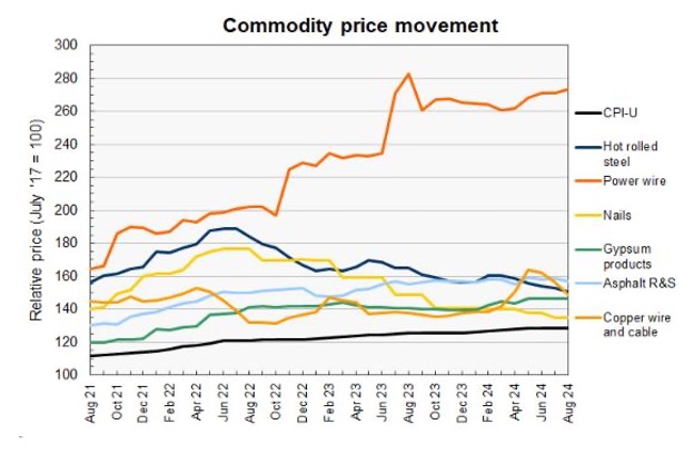동선 가격지수는 8월에 5.1% 하락하여, 건축 자재 가격의 하락 중에 가장 큰 하락 폭을 보여 주었습니다. 반대로 전력 선과 케이블의 가격 지수는 8월에 상승하여 팬더믹 이전 가격 수준과 비교하여 가장 크게 상승하였습니다. 못과 열연 철근 가격은 8월에 계속 하락하면서, 2022년 여름이후 하락 경향 입니다.