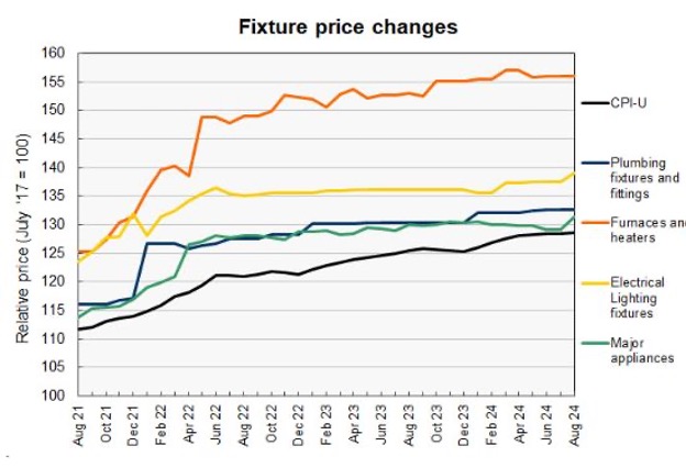 일부 건축 자재 중에 가격 지수가 믿을 수 없게 최근에 거의 안정적인 예도 있습니다. 예를 들어서 배관 장치와 부속품 그리고 보일러와 히터의 가격 지수는 지난 3개월동안 정확하게 똑 같았습니다. 중요 가전 제품의 가격 지수는 8월에 1.9% 상승하여, 두번째로 큰 상승폭을 보여 주었습니다. 전기 조명 기구의 8월 가격 지수도 의미 심장하게 상승하여 1.0% 상승하였습니다.