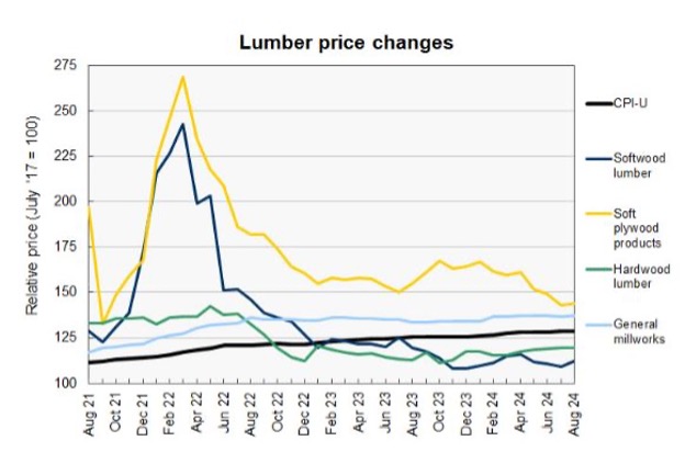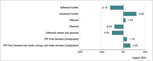 2024년 8월에 침엽수 제재목에 대한 미국 생산자 가격 지수(Producer Price Index : PPI)는 7월의 1.1% 하락을 회복하여 2.9% 상승하였다고 미국 노동 통계청(U.S. Bureau of Labor Statistics)은 보고하였습니다. 활엽수 제재목 생산자 가격 지수는 7월에 0.4% 상승한 이후에 8월에도 0.2%로 약간 상승하였습니다. 목공 제품의 생산자 가격 지수는 7월에 0.4% 하락한 이후에 8월에 반등하여 0.4% 상승하였습니다.