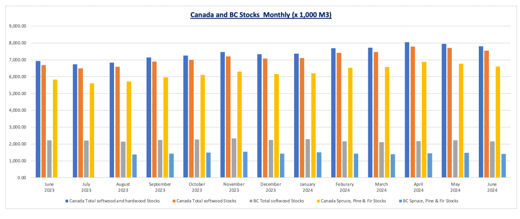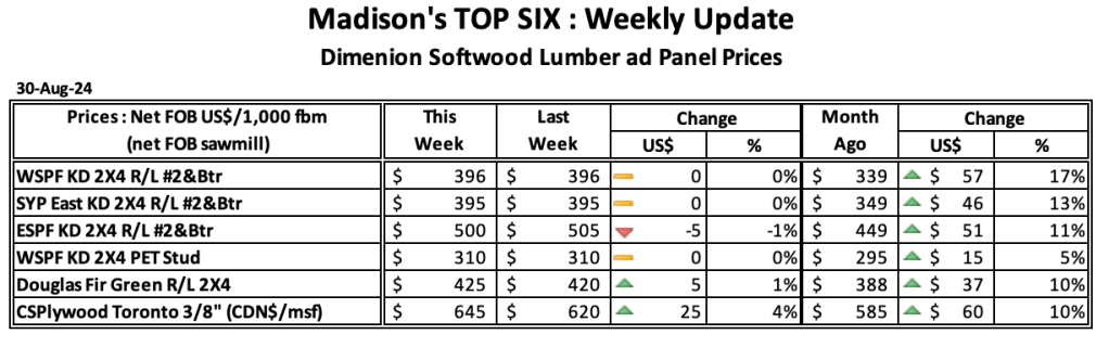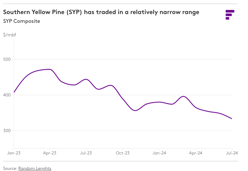 Southern Pine Composite 가격은 2024년 3월에 월간 가격이 최고로 $396이었고, 7월에는 $333이었습니다. $63 가격 범위는 2023년의 $116보다 심각하게 가격 변화폭이 좁았습니다. Southern Pine의 가격 변동이 적은 것은 또한 2024년에 광범위한 북미 시장에서 명백하였습니다. Southern Pine 거래자들은 공급과 수요는 2024년 전체적으로 평형에 가까운 균형을 유지할 것으로 예측합니다. 가을 건설 시즌이 다가오고, 선선한 날씨로 시공 업자들이 작업 활동을 늘릴 수 있기때문에 남부에서의 수요가 강화될 것이라고 주목합니다. 더군다나 미국 연방 준비 제도(Federal Reserve)기 올해가 끝나기 전에 적어도 한번은 최 우대 대출 금리를 하락 시킬 것이라는 가장 최근의 경제 경향으로 악화된 주택 시장에 활력을 줄 수 있습니다. 하지만 소비가 계절적인 상승을 보여줄지라도 앞으로 몇달 내에 수요가 눈에 띄게 증가할 것이라고 예상하는 거래인은 별로 없습니다. 공식적으로 발표하거나 좀 더 조용하게 실행중인 최근 공장들의 감산은 2024년 8월의 무기력한 수요에 공급이 맞추어 조정되는데 도움이 되었습니다. 일부 새로운 공장이 남부에서 운영을 시작하였지만 이런 감산들이 상승하는 생산량을 경감하는데 도움이 되었습니다.