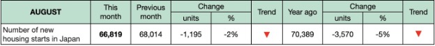 2024년 8월 일본의 전체 주택 신축은 전년대비 5.1% 하락하여 66,819 units 이었다고 일본 국토 교통성 관광청 (Japan Ministry of Land, Infrastructure, Transportation and Tourism)이 보고하였습니다. 전체 주택 중에서 목재 주택 신축도 전년대비 3.5% 감소하여 39,722 units이렀고, 전체 주택에서 약 59.4%를 차지하였습니다. 그리고 7월과 비교하면 전체 주택 신축과 목조 주택 신축은 각각 1.8%, 1.7% 하락하였습니다.