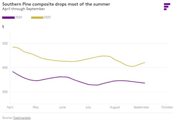 7월에 가격이 소폭 상승했던 Random Lengths Southern Pine Composite 는 8월과 9월 대부분 하락세를 보이고 있습니다. 최근 몇 주 동안 판매량이 완만하게 증가하였으며 소폭은 안정화되거나 소폭 상승하였습니다.