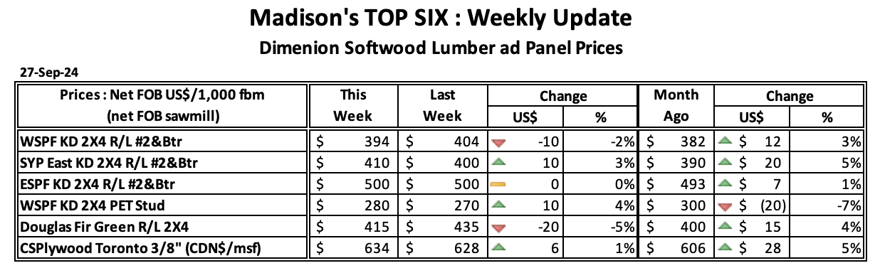2024년 9월 27일로 마감한 주의 Southern Yellow Pine East Side 2×4 #2&Btr KD (RL)의 가격은 US$410 mfbm으로 전주 가격인 $400와 비교하여 $10, 3% 상승하였고, 전월 가격인 US$390 mfbm에 비하여 $20, 5% 상승하였습니다. 1년전 같은 시기의 가격인 $530와 비교하면 $120, 23% 하락하였고, 2년전 같은 시기의 가격인 $595보다 $185, 31% 낮았습니다.