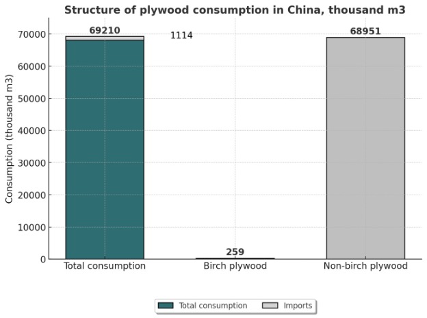 세계 최대 합판 소비국이자 생산국인 중국은 합판 수요의 98%를 자국 생산에 의존하고 있으며, 대부분 poplar, eucalyptus와 같은 저렴한 대체품입니다. 자작(birch)합판 수입은 여전히 소량이지만, 지난 5년 동안 20배 성장했습니다. Sveza는 주로 건축, 가구, 인테리어 수요에 힘입어 향후 10년간 중국의 잠재적 자작(birch)합판 소비량이 1 million m3에 달할 것으로 예상하고 있습니다. 하지만 중국으로의 수출은 낮은 가격과 결제 문제로 인해 어려움을 겪고 있습니다. 2023년 중국의 총 합판 소비량은 69,210 thousand m3이며 자작(birch)합판은 단지 259 thousand m3에 불과합니다.