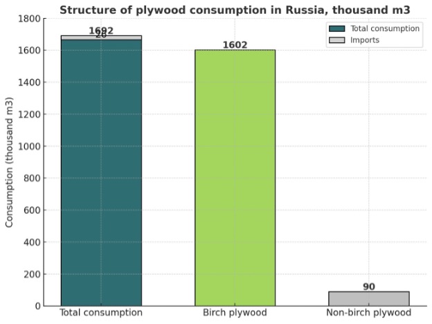 제재 이전까지 유럽과 북미는 러시아 자작(birch) 합판의 필수적 시장이었으며, 총 소비량은 1,673 thousand m3으로 2024년 현지 생산 능력 1,413 thousand m3을 능가하였다고 Sveza 합판 생산업체는 추정하였습니다.