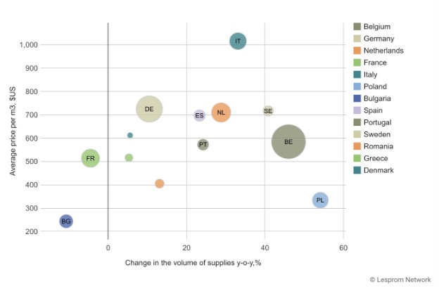 다른 시장은 다양한 결과를 보여주었습니다. 라트비아 수출량은 34% 감소하여 123 thousand m3이었고, 수출액도 28% 감소하였습니다. 반면 덴마크 수출량은 39% 증가하여 75 thousand m3이었고, 수출액도 44% 상승하여 $6.1 million 이었습니다. 핀란드 수출량은 보기 드물게 12배이상 증가하여 56 thousand m3이었고, 수출액도 16배이상 상승하여 $4.5 million이었습니다.