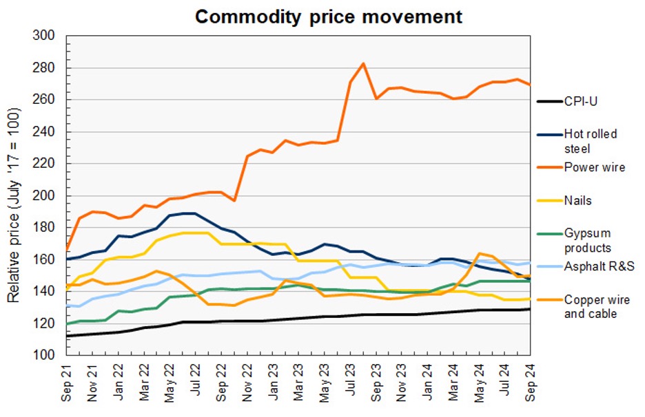 못(nail) 가격 지수도 9월에 약간 반등하여 0.4% 상승하였는데, 이는 지난 2년간의 하락 경향에서 벗어난 것입니다.