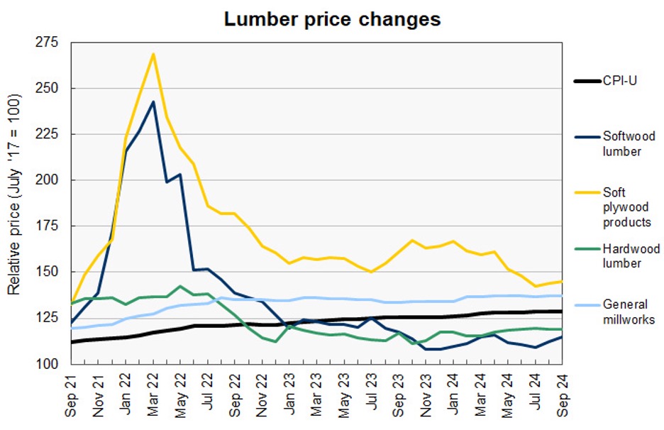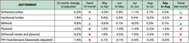 미국 노동 통계국(Bureau of Labor Statistics)의 가장 최신 미국 생산자 가격 지수 (Producer Price Index : PPI) 보고서에 따르면 침엽수 제재목 가격은 8월에 2.7% 상승한 이후에 9월에도 4% 상승하였습니다. 하지만 활엽수 제재목 가격은 8월 하락이후에 9월에도 0.2%로 약간 하락하였습니다. 목공 제품(Millwork) 가격은 8월에 0.3% 상승한 이후에 9월에도 단지 0.1% 상승하였습니다.