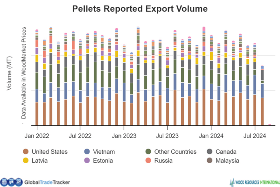 중국은 계속적인 부동산 침체에 직면하면서 합판 생산업체들은 자국 수요 부진을 상쇄하기 위하여 수출 시장으로 초점을 전환하였습니다. 합판 수출 증가는 건설 경기에 크게 의존하는 국내 가구 소비의 약세에 힘입은 것입니다. 2024년 1월부터 8월까지 중국의 활엽수 합판 수출량은 11% 증가하여 6.24 million m3, 수입액은 7.2% 상승하여 $2.7 billion이었습니다. 그리고 중국 활엽수 합판의 수출 평균 가격은 3.4% 하락하여 $436/m3이었습니다.