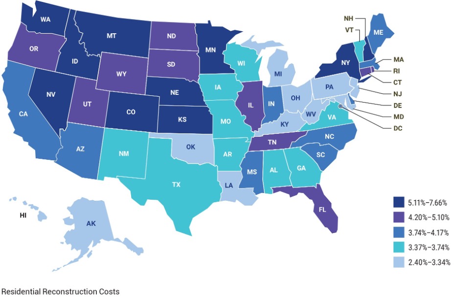 총 상업용 재건축 비용은 2023년 10월부터 2024년 10월까지 5.6% 상승하였고 2024년 7월부터 2024년 10월까지는 1.6% 상승하였습니다. 상업용 재건축 비용은 모든 주에서 최소 3.14% 증가했습니다. 주거비의 경우 New Hampshire가 11.92%로 가장 큰 폭으로 증가했으며, New York이 8.13%로 그 뒤를 이었습니다. Kansas는 39위에서 4위로 가장 많이 순위가 상승하였고 7.92% 증가하였습니다.