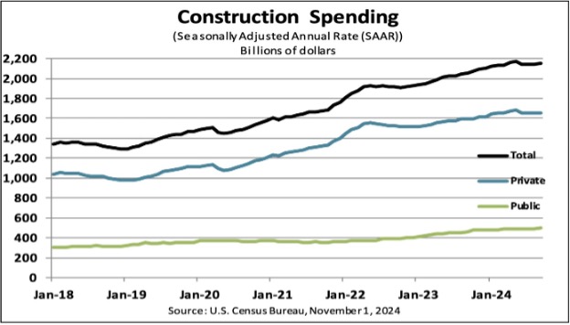 미국의 2024년 9월 건설 지출이 소폭 증가하였으며, 계절 조정 연간 비율(Seasonally Adjusted Annual Rate : SAAR)로는 $2,148.8 billion이어서 8월 개정 수치인 $2,146.0 billion보다 0.1% 증가한 것으로 추정됩니다. 2024년 9월 지출 수준도 2023년 9월보다 4.6% 증가하여 $2,055.2 billion를 기록하였습니다. U.S. Census Bureau에 따르면 2024년 9개월 동안 건설 총지출은 $1,621.4 billion로 작년 같은 시기의 $1,511.4 billion보다 7.3% 증가하였습니다.