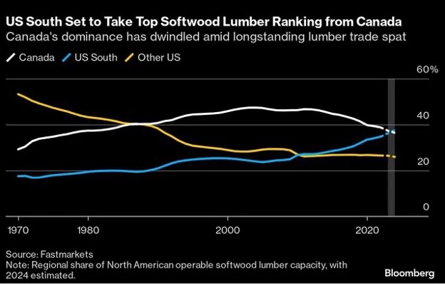 미국은 저가 목재 덤핑의 캐나다 C$10 billion ($7.2 billion) 산업을 오랫동안 비난해 왔으며, 캐나다 벌목업자들이 목재 수확을 위해 지불하는 정부 수수료가 보조금에 해당한다고 주장해 왔습니다. 이 분쟁은 특히 2022년 수출된 원자재 가치의 1/4을 차지한 캐나다 British Columbia에 영향을 미쳤습니다. 잠재적 추가 부과금에 대하여 BC Council of Forest Industries의 수석 경제학자인 Kurt Niquidet는 BC뿐만 아니라 캐나다 전역에서 광범위한 감산이 발생할 것이라고 주장하였습니다. 캐나다 제재소, 특히 British Columbia가 높은 비용과 낮은 수익으로 어려움을 겪고 있는 가운데, 남부가 입지를 다지고 있습니다. 미국 제재목 연합(U.S. Lumber Coalition)은 미국의 투자와 역량을 신장시킨 관세를 인정합니다. Fastmarkets의 수석 경제학자인 Dustin Jalbert에 따르면 북미는 올해 폐쇄를 통하여 제재소 생산 능력의 4%를 잃었으며, 그 중 40% 이상이 British Columbia에 있습니다. 산림 회사 Canfor Corp. 는 9월에 관세와 목재 공급 부족을 이유로 British Columbia 제재소 2곳을 연말까지 폐쇄하고 C$100 million의 감가상각을 단행할 것이라고 발표하였습니다. 세계 최대 제재목 제조업체인 West Fraser Timber Co.와 소규모 경쟁 업체인 Interfor Corp.과 Western Forest Products Inc.도 캐나다 서부 공장을 중단하거나 폐쇄하였습니다. Interfor와 Western Forest Products은 논평을 거부하였고, West Fraser와 Canfor는 논평 요청에 응답하지 않았습니다.