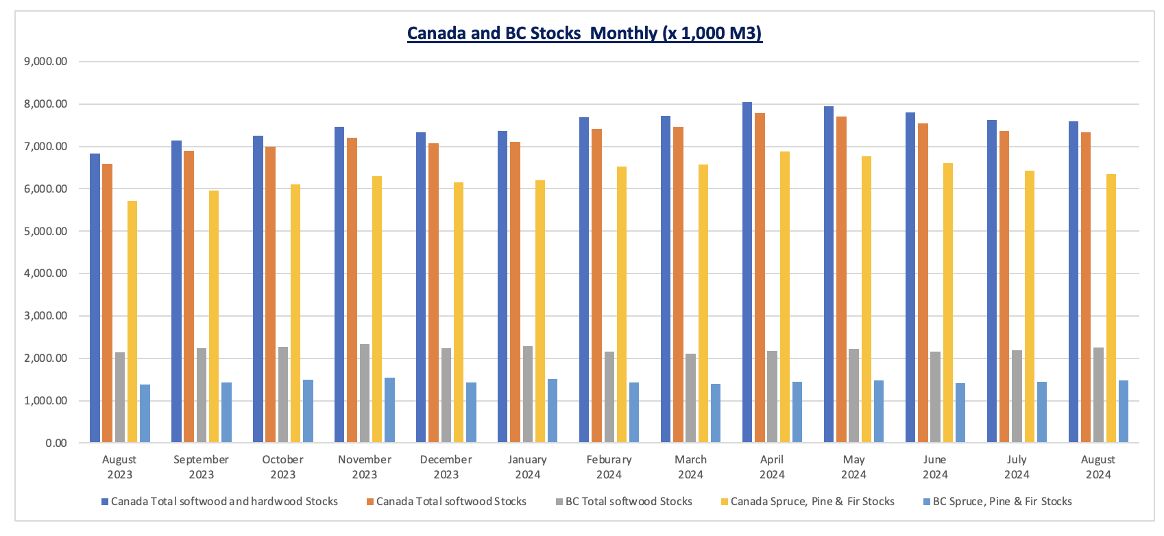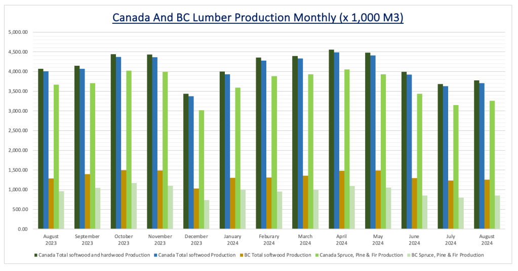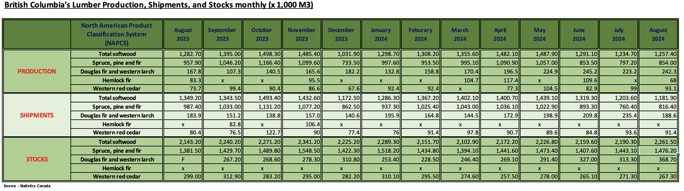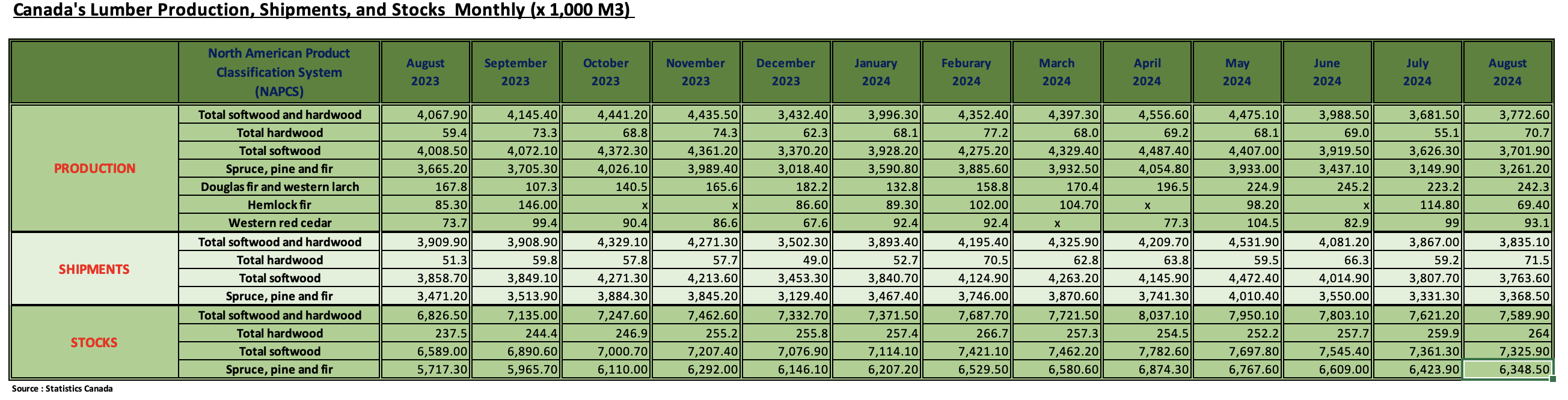 2024년 8월 캐나다 제재소들의 제재목 생산량은 7월과 비교하여 2.5% 증가하여 3,773 thousand m3이었다고 캐나다 통계청(Statistics Canada)은 발표하였습니다. 하지만 제재목 생산량의 월간 상승에도 불구하고 2023년 8월의 제재목 출하량은 0.8%로 약간 하락하여 3,835 thousand m3이었습니다.