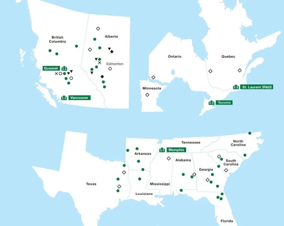 아래의 지도는 2023년 연말 보고서에 포함된 지도인데 Vancouver에 본사를 둔 West Fraser의 캐나다와 미국 내 사업장을 보여주며, 녹색 점은 공장을 나타냅니다.
