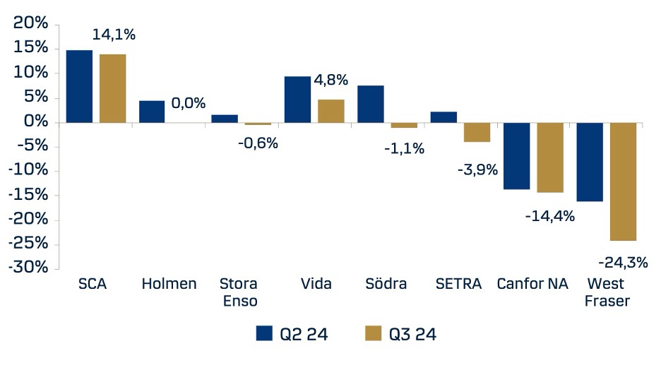 Danske Bank의 분석에 따르면 스웨덴 제재소 기업의 평균 영업 마진은 기록적인 원자재 비용으로 인하여 2분기 6.7%에서 2024년 3분기 2.2%로 감소하였습니다. 이러한 감소는 3분기 판매 가격이 소폭 상승했음에도 불구하고 비용 상승으로 인한 심각한 압박을 강조합니다. 4분기 예상은 판매 가격 정체와 비용 상승을 예고하고 있는 상황에서 연말 마진이 0에 도달할 위험이 있습니다.