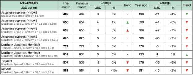 2024년 12월 Japanese cypress (Hinoki) 제재목 (Grade 2, 10.5 cm x 10.5 cm x 3.0 m) 의 도매 가격 평균은 $469/m3으로 11월과 비교하여 변화가 없었지만, 2023년 12월과 비교하면 $21, 4% 낮았다고 일본 농림 수산 식품부 (Ministry of Agriculture, Forestry and Fisheries of Japan)가 보고하였습니다. 같은 등급, 사이즈의 인공 건조 제품의 도매 가격 평균은 12월에는 11월과 비교하여 $4, 1% 하락하여 $658/m3이었고, 2023년 12월과 비교하면 $41, 6% 낮았습니다. 인공 건조된 Grade 2 cypress 제재목 (12.0 cm x 12.0 cm x 3.0 m)의 12월 가격은 $659/m3으로 11월에 비하여 $3, 0.5% 하락하였고, 2023년 12월보다는 $48, 7% 하락하였습니다. 2024년 12월 인공 건조된 Grade 2 version (10.5 cm x 10.5 cm x 3.65~4.0 m)의 가격은 11월과 비교하여 꾸준히 $623/m3을 유지하였지만 전년대비 $61, 9% 하락하였습니다.