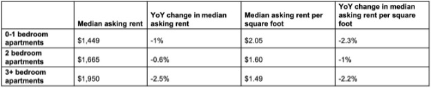 12월에 모든 사이즈 아파트에서 임대료가 하락했습니다. 0-1 침실 아파트의 중위 임대료는 전년 대비 1% 하락한 $1,449, 2 침실 아파트는 0.6% 하락한 $1,665 이었습니다. 가장 큰 폭의 하락은 3침실이상 아파트에서 나타났으며, 2.5% 하락한 $1,950를 기록하였습니다.