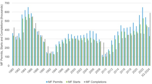 Multifamily Permits, Starts and Completions (5+ Units) / Freddie Mac, Census Bureau, Moody’s Analytics