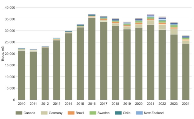폴란드 국영 뉴스 통신사 PAP의 보도에 따르면, 주 소유 산림 책임자인 Witold Koss는 2025년에 시장에 공급가능한 목재량은 38 million m3으로 2024년과 비교하여 5% 감소하였습니다. 중앙 통계청(Central Statistical Office : GUS)의 데이터에 따르면, 2019년부터 2023년까지 폴란드는 14.3 million tons의 가공되지 않은 목재를 수출하였으며, 독일로의 수출이 전체 수출의 37%에 해당하는 5.3 million tons이어서 가장 많은 양을 수출하였습니다. 2024년 수출량은 2.2 million tons이었는데, 43%는 주로 슬로바키아, 체코, 스웨덴, 리투아니아, 에스토니아와 같은 국가로, 40%는 독일로 수출되었습니다.