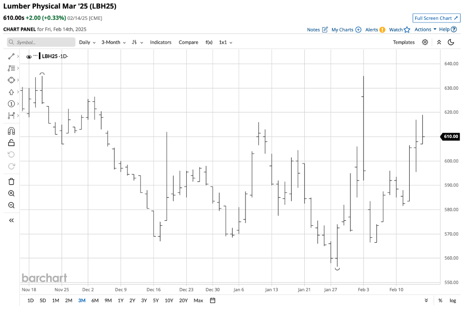 2025년 3월 CME 제재목 선물 가격은 1월 17일의 $595 수준이고, 2월 보다는 약간 높습니다. 제재목 가격은 꾸준하지만 2024년 중반이후 경향은 상승하고 있습니다. $610/1,000 board feet 수준에서 실물 제재목 선물 가격은 2025년 2월말에 안정적이었습니다.