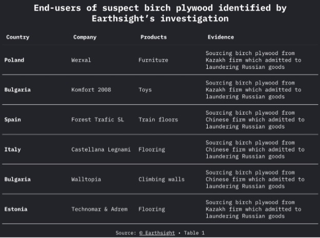 몇몇 EU 기업들은 비밀 녹음을 통해 불법 러시아 자작나무(birch) 합판을 구매했다고 인정했습니다. 여기에는 제조업체에 재판매하는 교역자뿐만 아니라 2024년 파리 올림픽 예선전에 공급한 세계 최대 등반벽 제조업체인 Walltopia와 같은 직접 구매자도 포함됩니다. 다른 고객으로는 에스토니아의 바닥재 공급업체인 Technomar와 Radisson, Hilton, Marriott와 같은 주요 호텔 체인에 바닥재를 공급하는 Adrem이 있습니다. Black Red White에 공급하는 폴란드 가구 공급업체 Werxal, 유럽의 주요 장난감 회사에 공급한다고 주장하는 불가리아의 Komfort, 스페인 도매업체 Forest Trafic, 이탈리아 바닥재 회사 Castellana Legnami가 추가로 연루된 기업입니다. Earthsight는 이들 기업이 고의로 제재를 위반했다는 증거는 없지만, 이번 조사 결과는 공급업체 선정에 더 많은 주의를 기울여야 한다고 지적합니다. Walltopia, Werxal, Black Red White는 Earthsight의 문의에 응답하지 않았습니다. Technomar와 Adrem은 독립적인 감사를 통해 자작나무((birch) 합판이 카자흐스탄과 우크라이나에서 생산되었음을 확인했다며 잘못을 부인하였습니다. Komfort와 Castellana Legnami도 위반 사실을 부인하였으며, Forest Trafic은 스페인 당국과 국제 모니터링 회사인 Bureau Veritas의 실사 시스템을 통하여 검토하였다고 강조하였습니다.