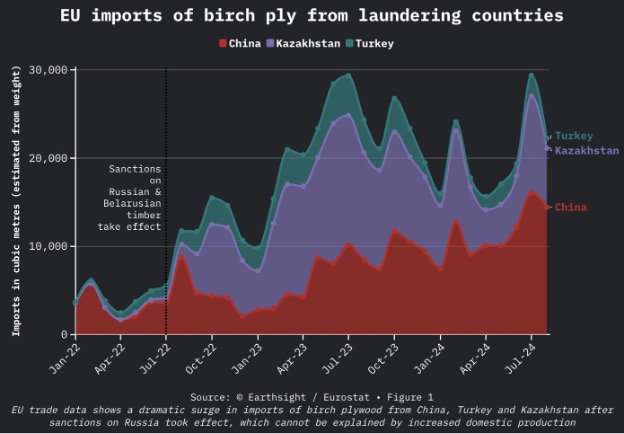 Earthsight의 조사 결과에 따르면 자작나무(birch) 합판은 모든 숲이 국유림인 러시아 경제의 중요한 수입원입니다. 이 단체는 러시아 군대가 벨기에 면적의 1.5배가 넘는 면적의 산림을 직접 통제하고 있다고 주장합니다. 제재가 부과된 이후 러시아 수출업체들은 적발을 피하기 위해 중국, 카자흐스탄, 튀르키예 제3국을 통해 자작나무 (birch) 합판 선적을 allegedly 세탁한 것으로 알려졌습니다. Earthsight에 따르면 무역 데이터와 세관 기록에 따르면 비즈니스가 호황을 누리고 있는 것으로 나타났습니다.