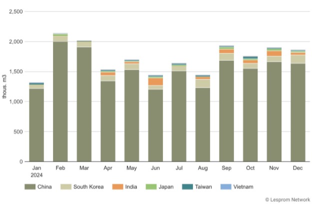 한국의 수출은 전체 수출량의 6%로 하락하면서 수출량은 31% 감소한 1.1 million m³, 수출액은 33% 감소한 $97 million 이었습니다. 한국 수출 평균 가격은 3% 하락하여 $85/m³이었습니다.