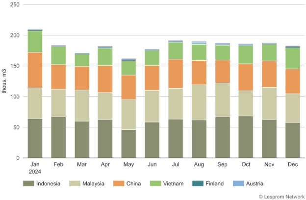 일본의 합판 수입량의 최대 공급 국가는 인도네시아로 전체의 33%를 차지하였고 2024년 수입량은 전년대비 9% 증가하여 739 thousand m3이었고, 수입액은 꾸준히 유지되어서 $439 million이었습니다. 인도네시아 합판 일본 수입 평균 가격은 9% 하락하여 $593/m3이었습니다. 그 다음은 전체의 27%를 차지한 말레이시아로 2024년 일본 수입량은 12% 증가하여 592 thousand m3이었지만, 수입액은 4% 감소하여 $328 million이었고, 평균 가격도 14% 하락하여 $554/m3이었습니다. 중국 합판은 일본 전체 수입량의 23%를 차지하였고, 2024년 수입량은 5% 감소하여 513 thousand m3, 수입액은 12% 감소하여 $231 million, 수입 평균 가격은 8% 하락하여 8% $451/m3 이었습니다. 베트남 합판의 일본 수입량은 전체의 15%로 2024년 수입량은 13% 증가하여 330 thousand m3, 수입액도 5% 증가하여 $95 million, 수입 평균 가격은 7% 하락하여 $288/m3이었습니다.